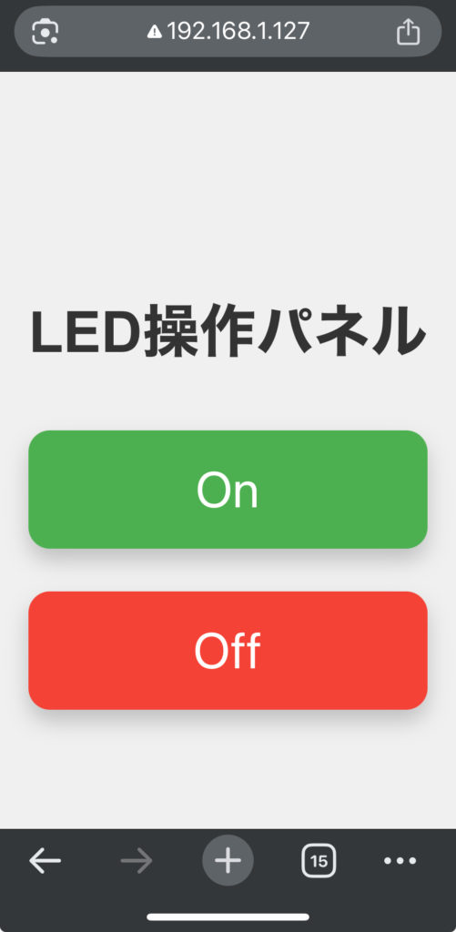 IPAddress subnet(255, 255, 255, 0);これで、スマートフォンからESP32に接続されたLEDをオンオフできるようになるはずです。もし何か不明な点があれば、お気軽にご質問ください!